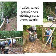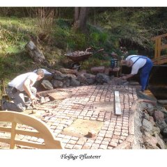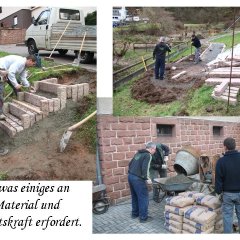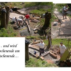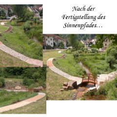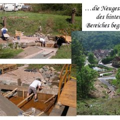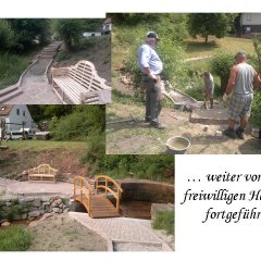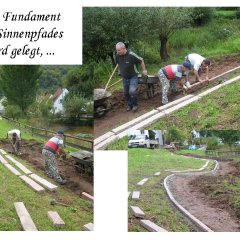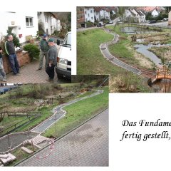 Während dieser wochenlangen Arbeit reifte dann der Plan, den Bereich zu verschönern und einen Barfußpfad anzulegen. Ich bin sehr froh und glücklich, dass sich die Helfer an dem Projekt begeistern ließen und wir gemeinsam den Plan in die Wirklichkeit umsetzen konnten. Und selbst während der Bauphase wurde die Planung ständig erweitert. Sollte zunächst nur ein Pfad entlang des Weihers bis zum Sandsteinbecken angelegt werden, kam bald die Idee auf, das Becken mit einer Brücke zu überwinden und danach einen Anschluss an den Spielplatz mittels einer Treppe zu bauen.