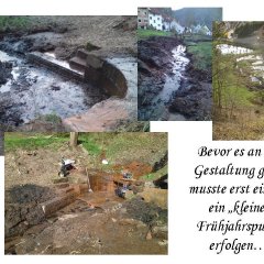 Mein Ziel war es zunächst, lediglich das Sandsteinbecken am unteren Ende des Zulaufes sauber zu machen, die Weiden zu stutzen und vielleicht ein oder zwei kleinere Wasserflächen für Amphibien frei zu legen. Nachdem jedoch der Bereich um das Sandsteinbecken freigelegt war, wurde klar, dass das Ganze größere Ausmaße annehmen wird. Man kann nicht ein ca. 1 Meter tiefes Becken vom Schlamm befreien und den daran anschließenden Sumpf einfach stehen lassen.