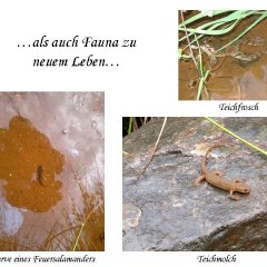 Durch die Maßnahmen am Sumpf hat sich Zahl und Art der Lebewesen deutlich verändert. Im Frühjahr wimmelt das Wasser von Fröschen, im Sommer sind inzwischen 5 Arten Libellen zu beobachten. Auch Feuersalamander und Teichmolch konnte ich schon sichten. Die Fauna ist an manchen Stellen schon zu mächtig, so dass regulierend eingegriffen werden muss um Wasserfreiflächen im Sumpfbereich zu erhalten.