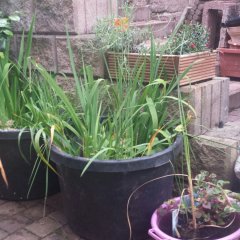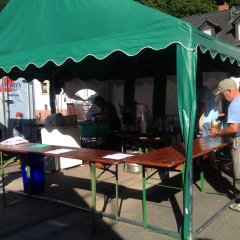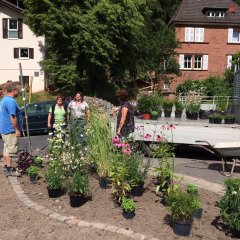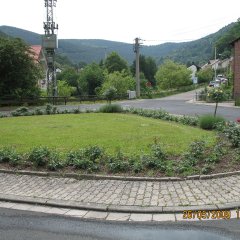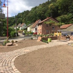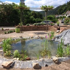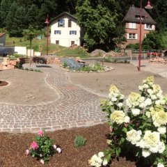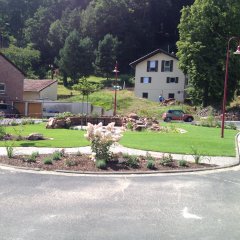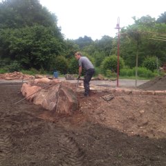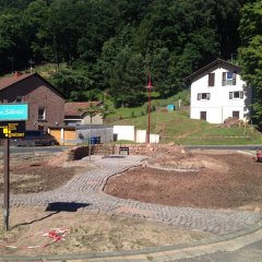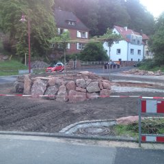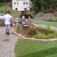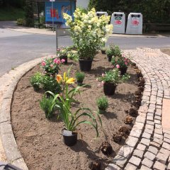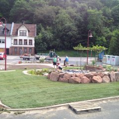 Das Ergebnis kann sich sehen lassen. Ein schönes Fugenbild ohne die Pflaster- und Sandsteine mit Zementmörtel zu verschmieren, ohne eine Menge Wasser zu verbrauchen um den Zementschleier zu entfernen. Die vorgesehenen Blumenbeete bekamen ebenfalls eine Umrandung aus Pflastersteinen und um die Pflege des Rondells für den Gartenbauverein zu erleichtern, wurde eine Bewässerungsanlage eingebaut. Nachdem tonnenweise Mutterboden eingebaut worden war, wurden die Blumenbeete vom Gartenbauverein nach Vorgabe von Mathias Klamer bepflanzt. Anschließend wurde die Teichfolie eingebaut, der Quellstein gesetzt und der Bachlauf zum Teich hin modelliert und mit Folie ausgekleidet. Ursula und Siegfried Nickel unterstützten dabei die bekannte Truppe des Gartenbauvereins auch beim anschließenden Füllen und Bepflanzen des Teiches. Im Bereich der Sitzfläche wurden zwei Schirmplatanen gepflanzt, zwischen die eine Sitzbank gestellt wurde. So wird man in einigen Jahren gut beschirmt dort sitzen und das Plätschern des Wassers genießen können.