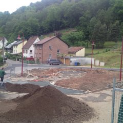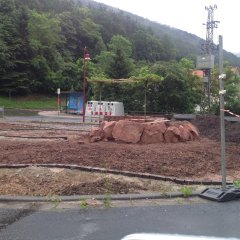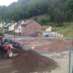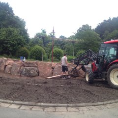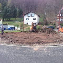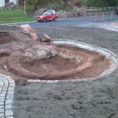 Nachdem im Zuge der Beleuchtungsumstellung auf LED die große Leuchte in der Mitte des Rondells weichen und drei neue Laternen installiert werden mussten, war es notwendig, das Gehwegpflaster rund um das Rondell zu entfernen, die Fläche sollte zukünftig ebenfalls bepflanzt werden. Das Entfernen des Pflasters wurde von Stephan Fränzel, Dieter Knoll und Johannes Hesser erledigt. Anschließend waren Baggerarbeiten notwendig, mit Hilfe des kostenlos zur Verfügung gestellten Baggers von Eric Schmalz wurden von Frank Bilgen die Rosen ausgegraben und Pflanzflächen ausgebaggert. Auch die Fläche für die Wege und die Sitzfläche wurden mit Hilfe des Baggers planiert.