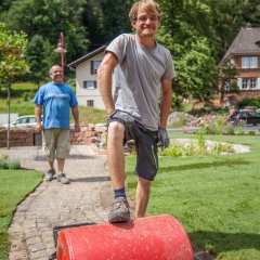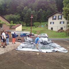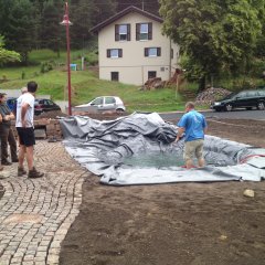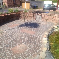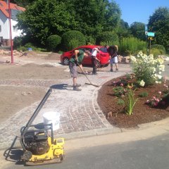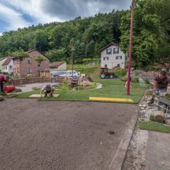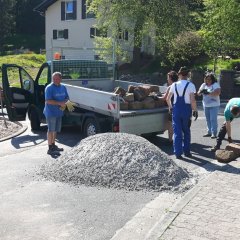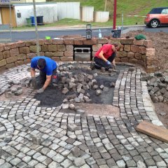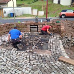 Noch während die Materialien angeliefert wurden, was bei mehreren Tonnen Pflaster einige Zeit in Anspruch nahm, fingen Christoph Baumann und Mathias Klamer mit dem Setzen der großen Pflastersteine als Randstreifen für die Wege und die Sitzfläche an. Diese wurden in Beton gesetzt um eine gute Festigkeit für das anschließend eingebracht Schotterbett und die darauf in Feinsplitt verlegten Pflasterflächen zu gewährleisten. Danach stand die Pflasterung der Wege und Sitzfläche an, hier zeigten unsere Arbeiter ihr ganzes Können. Nicht einfach gerade, sondern kunstvoll geschwungen wurden die Pflastersteine gesetzt, ein tolles Bild. Rolf Stoner und Bernd Camin haben unsere Arbeiter beim Einkehren des Materials unterstützt, damit die Fläche an einem Tag in einem Guß fertiggestellt werden konnte.
