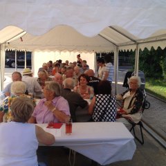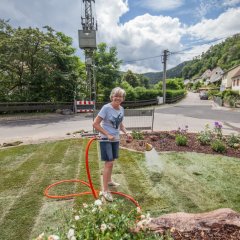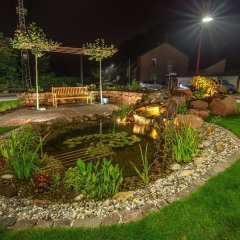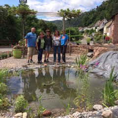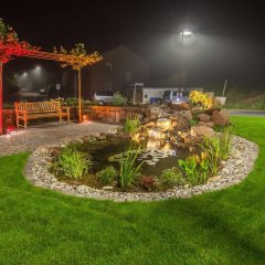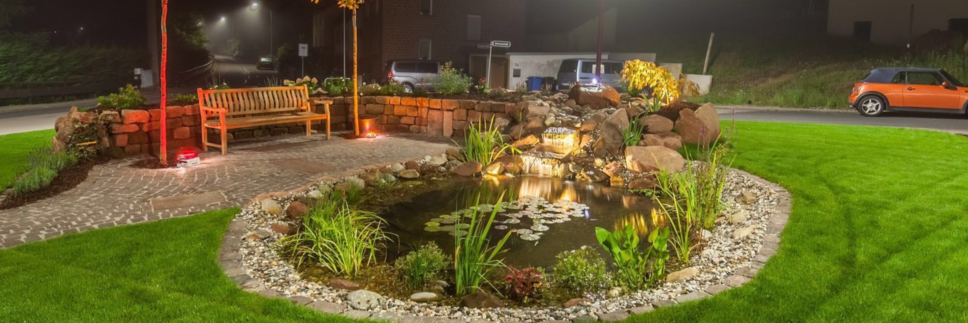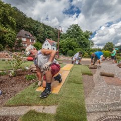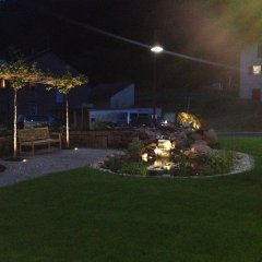 Auch des Nachts beeindruckt die Anlage durch die Bodenstrahler unter den Platanen und am Wasserlauf, die eine wunderbare Beleuchtung ergeben. Zu guter Letzt wurde der Rollrasen verlegt, bei dieser Arbeit waren viele helfende Hände am Werk. Zu den bereits genannten Personen gesellten sich Gerda und Herbert Bertram, deren Tochter Denise versorgte die Arbeiter mit Kaffee und Kuchen und nach getaner Arbeit wurde das fertige Werk mit einigen Gläsern Winzersekt begossen.