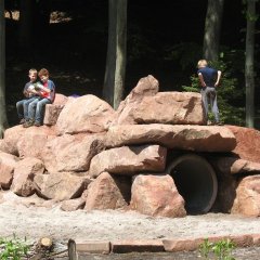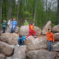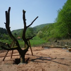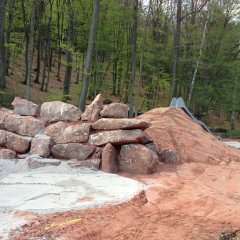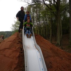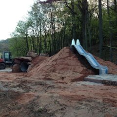 Die Entstehung des Waldspielplatzes war ein fließender Prozess und es wurden viele spontane Ideen umgesetzt. So entstand der beeindruckende Kletterhügel aus Sandstein und ein Tunnel mit einer Länge von 5 m, ein Highlight für unsere Kinder. Anschließend wurde auch eine Rutsche am Waldspielplatz errichtet, welche natürlich auch ausgiebig getestet und für gut empfunden wurde.